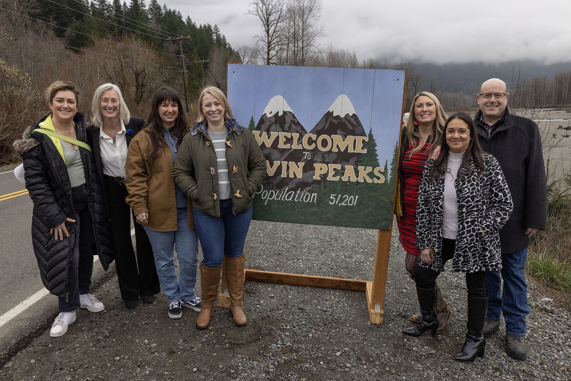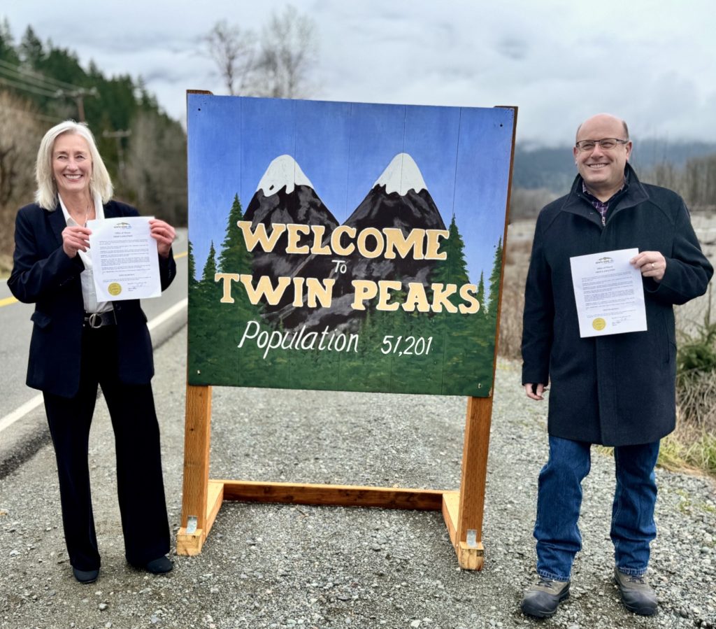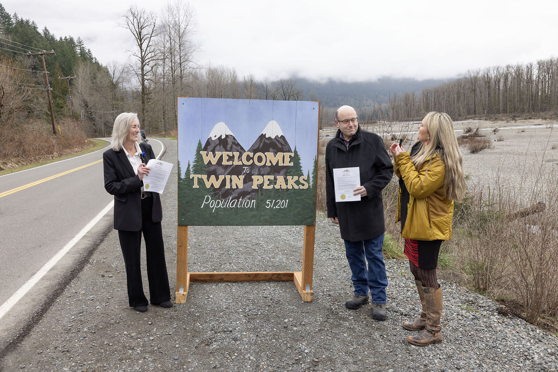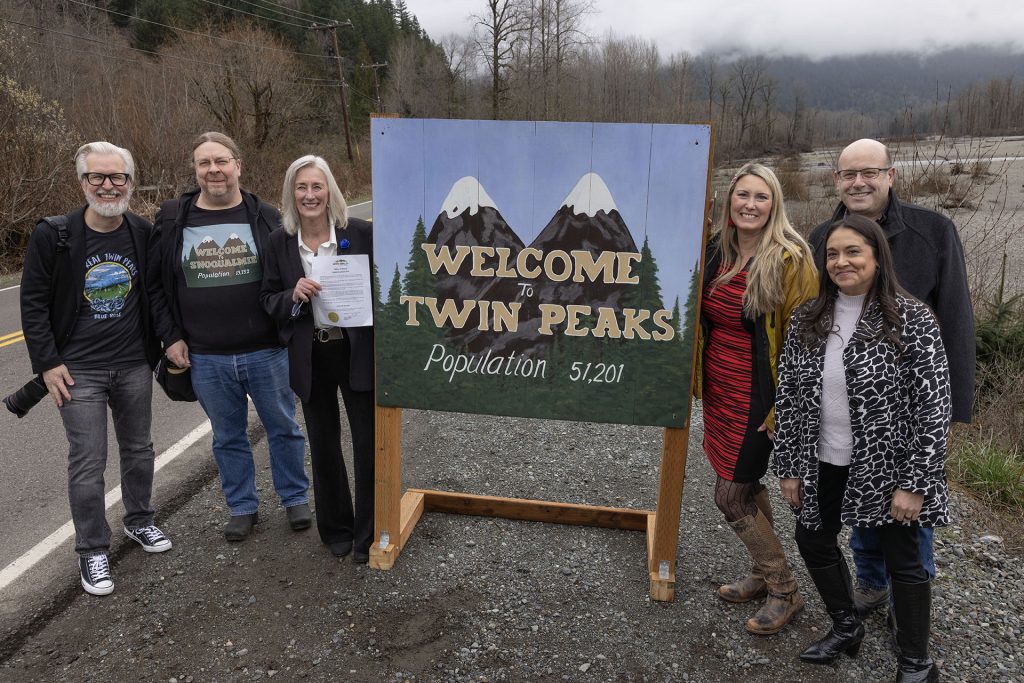North Bend Mayor Mary Miller and Snoqualmie Mayor Jim Mayhew took their places next to the sign, each with their city’s respective “Twin Peaks Day” proclamations inhand.