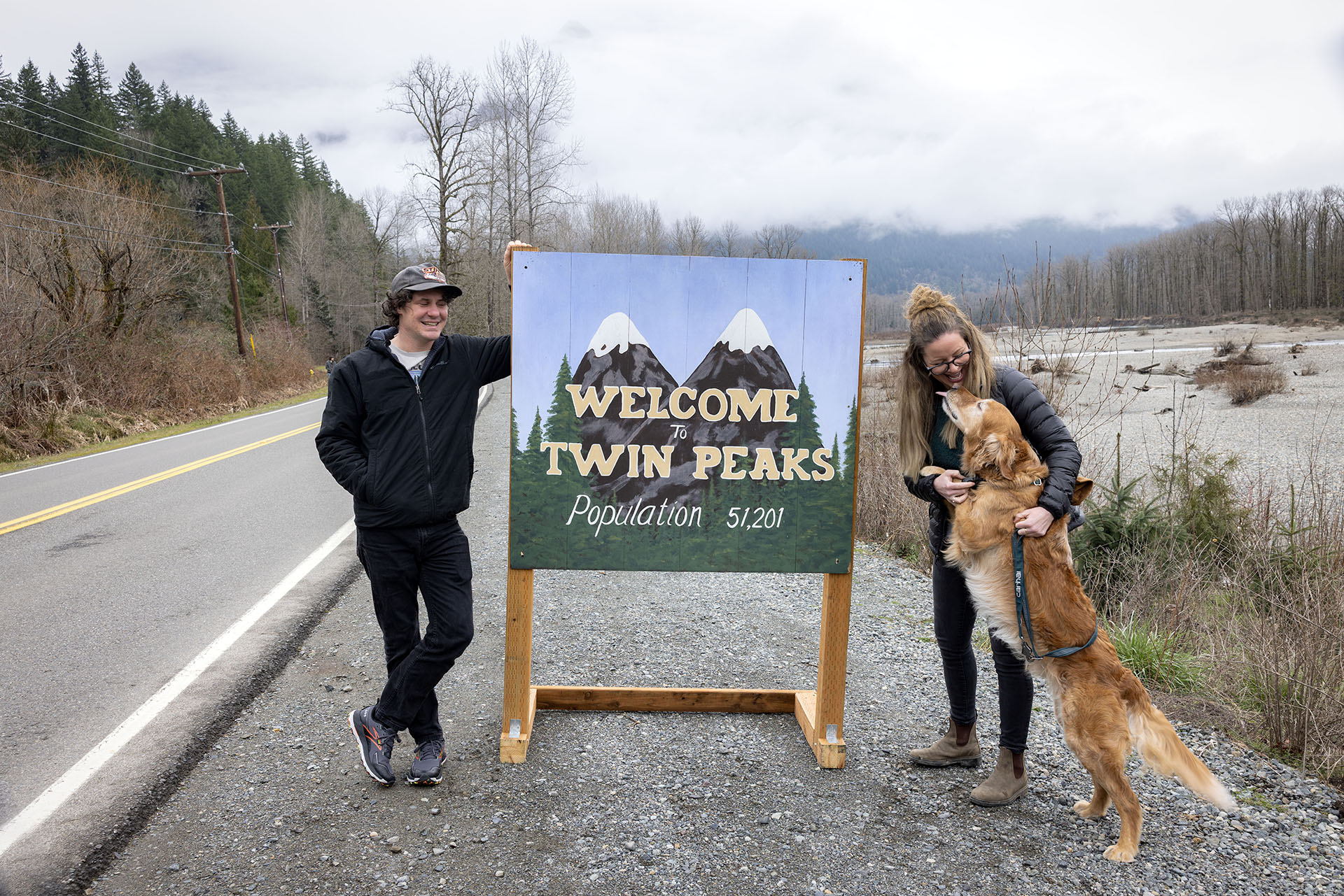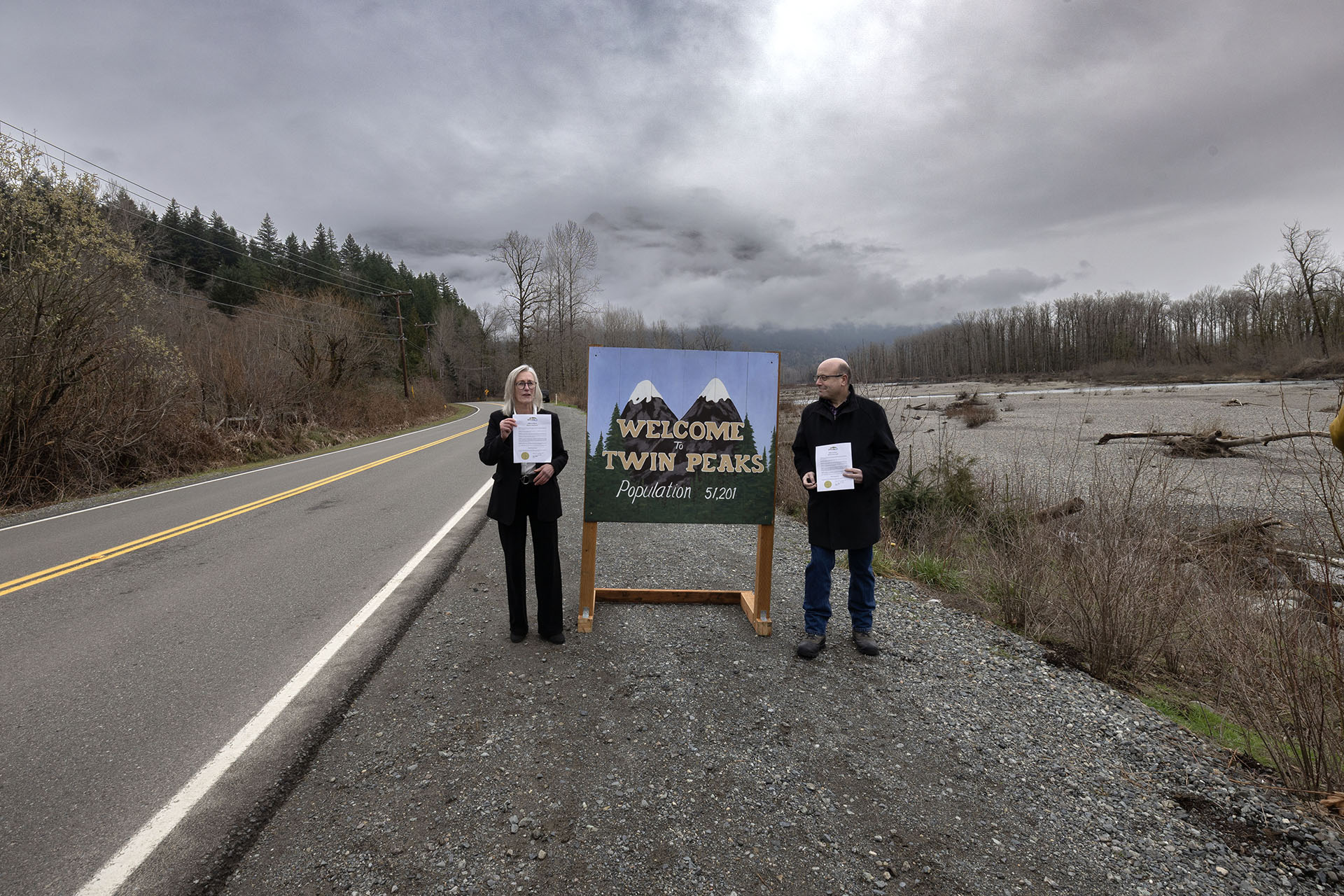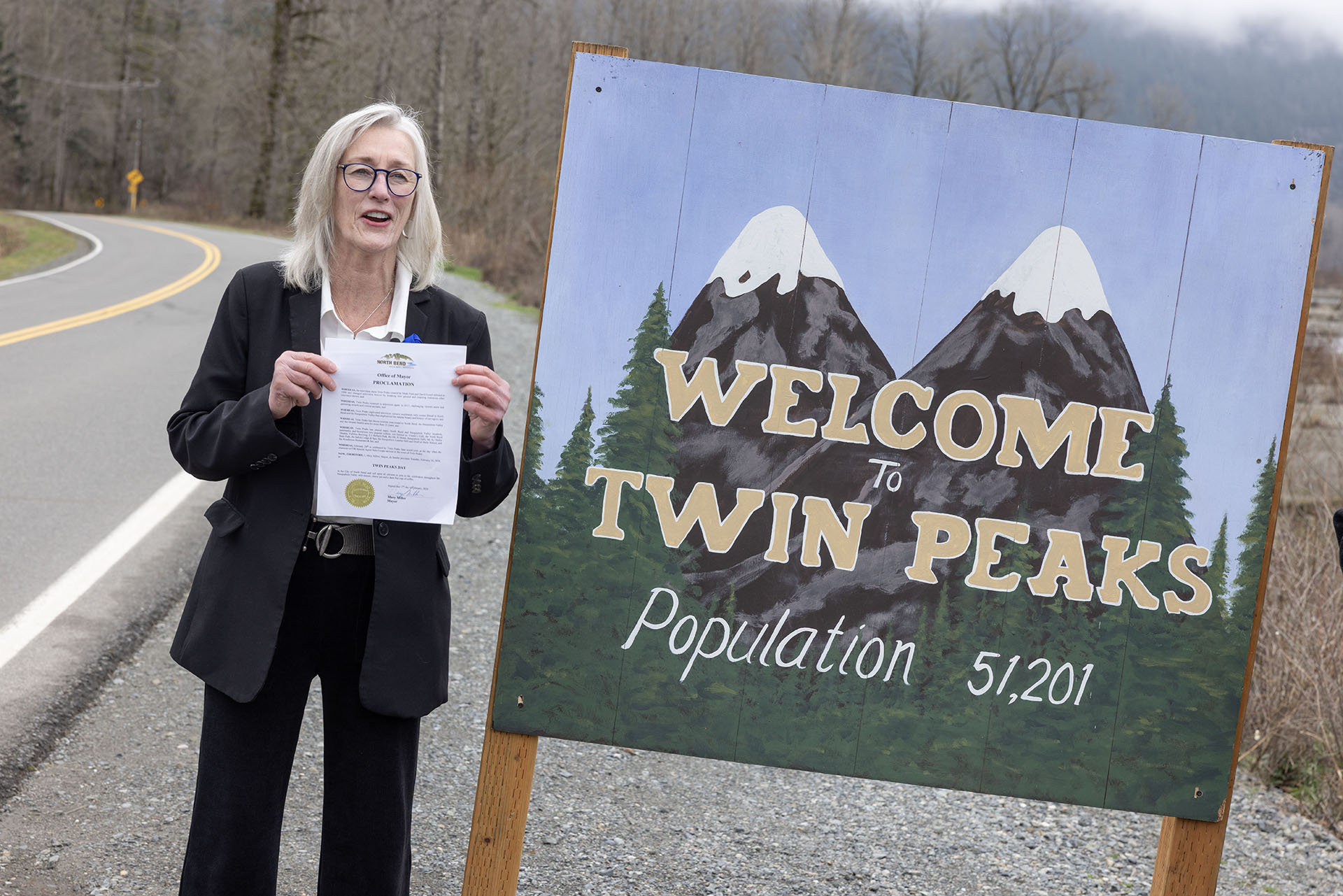 North Bend Mayor Mary Miller and Snoqualmie Mayor Jim Mayhew took their places next to the sign, each with their city’s respective “Twin Peaks Day” proclamations inhand.
