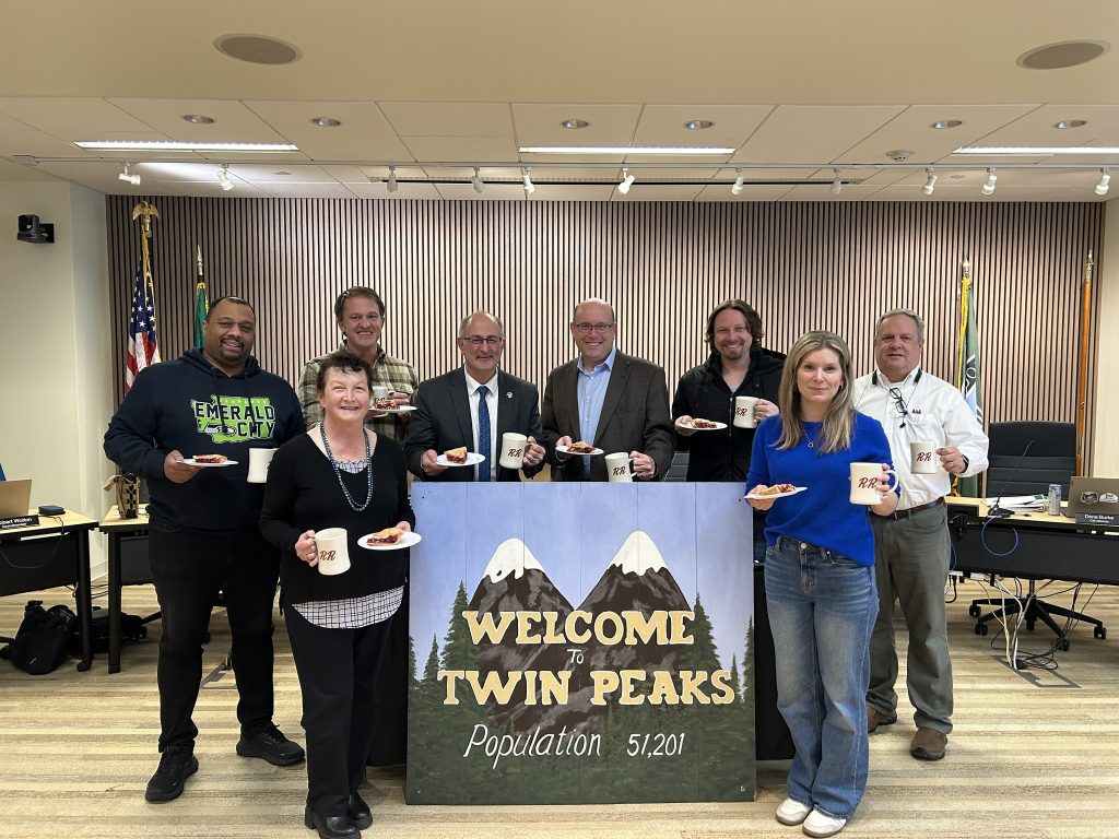 I love this shot of the Snoqualmie government office team posing with coffee and cherry pie.