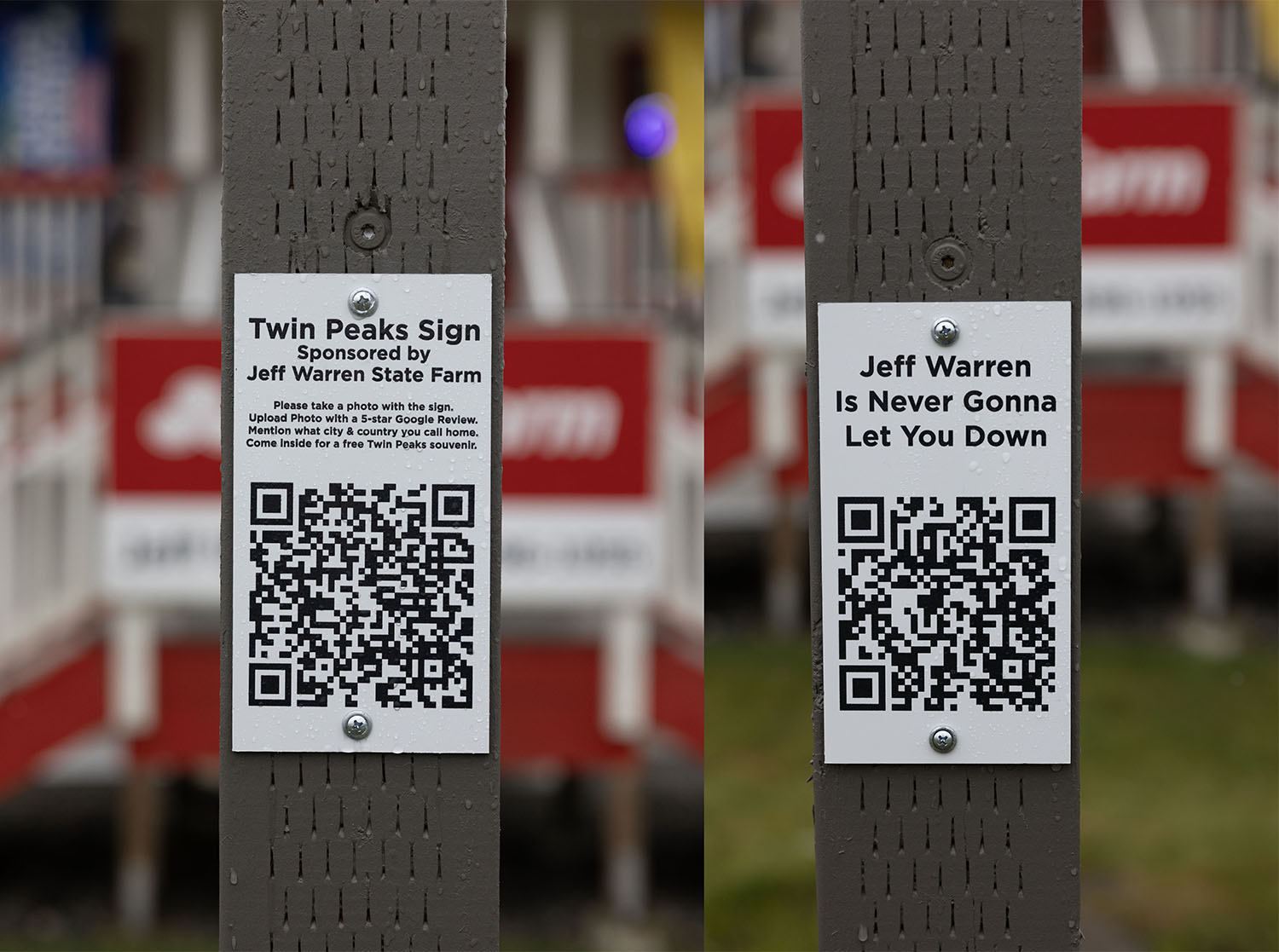 Next time you are visiting Snoqualmie, Washington, I invite you to stop by a replica Welcome to Twin Peaks sign that’s now located outside the Jeff Warren State Farm office. During the recent Real Twin Peaks event, I stopped by the sign to grab photos and chat with Jeff whom I profiled in a Twin Peaks Blog article.