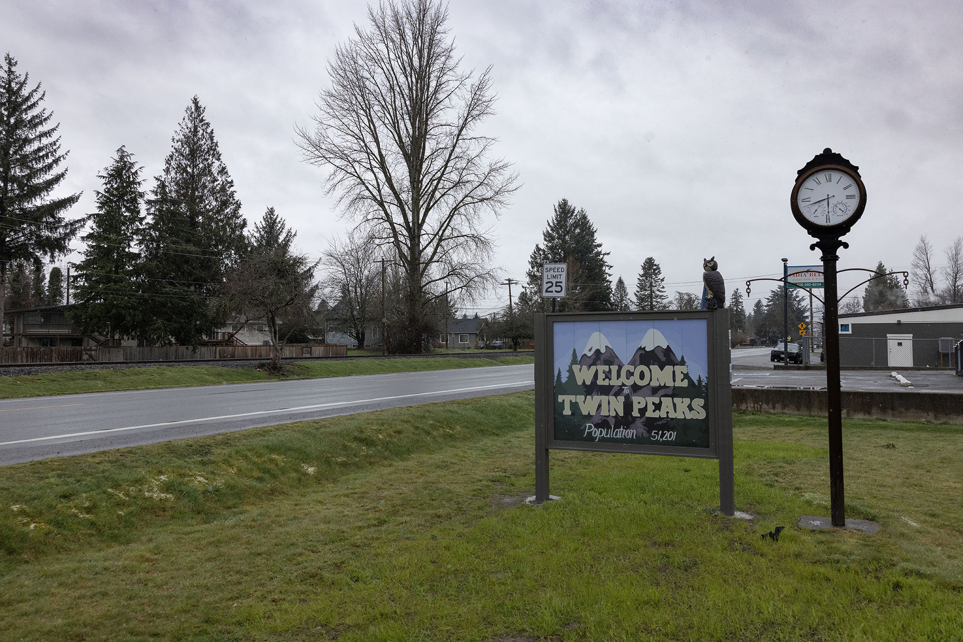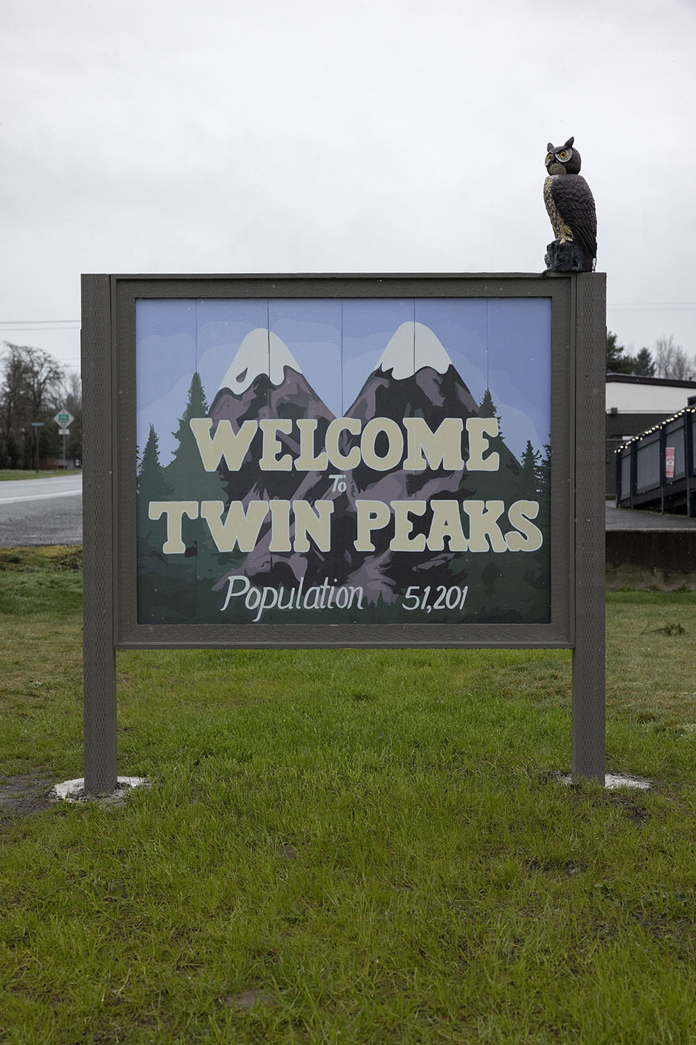 The sign is double sided so you see the “Welcome to Twin Peaks” greeting whether you are entering or leaving the town of Snoqualmie.
