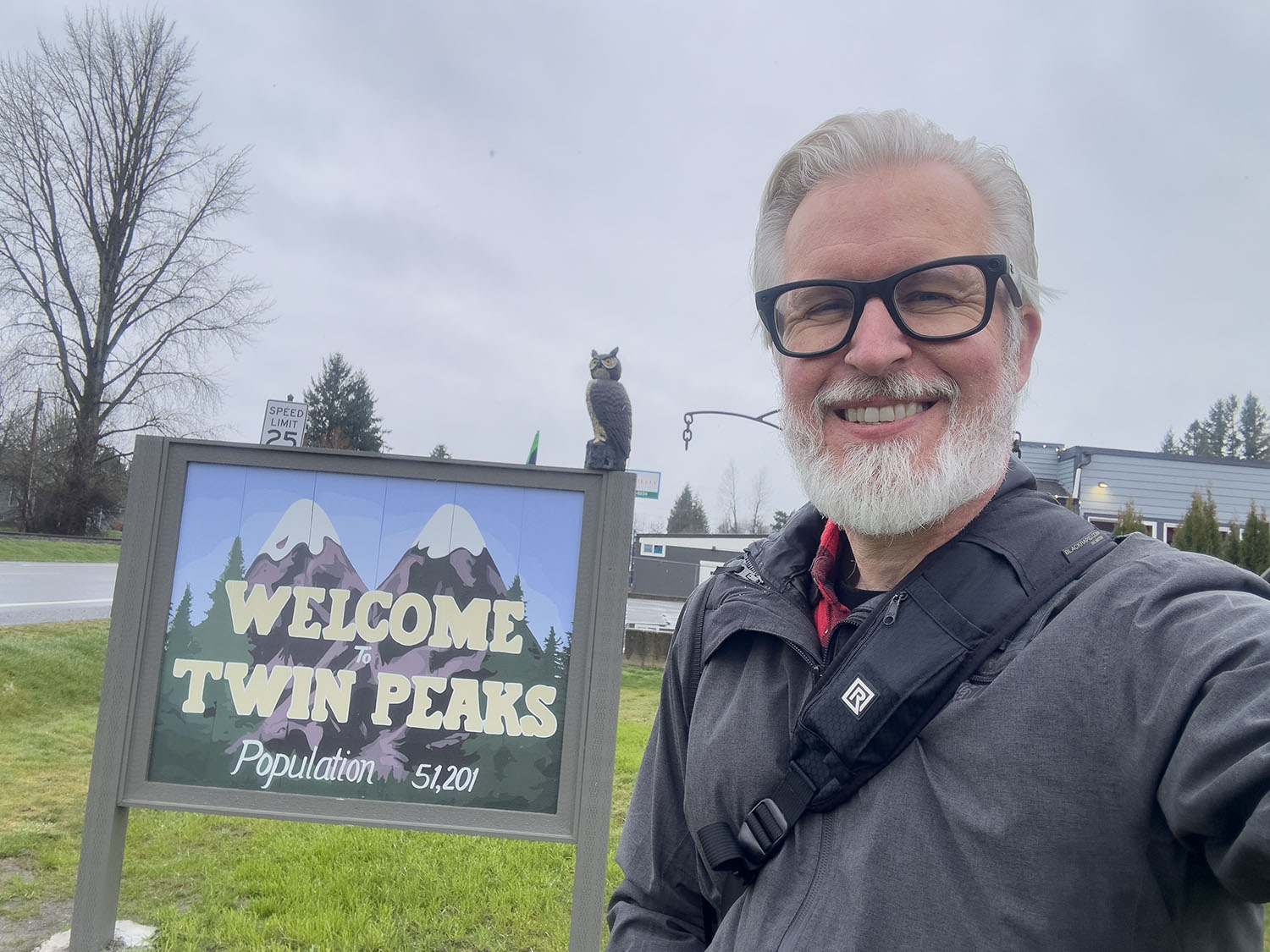 During my first full day in Snoqualmie Valley for the Real Twin Peaks 2026 event, I stopped by Jeff Warren State Farm to see his “Welcome to Twin Peaks” sign. He sponsored this year’s celebration of the towns where Mark Frost and David Lynch filmed their show.