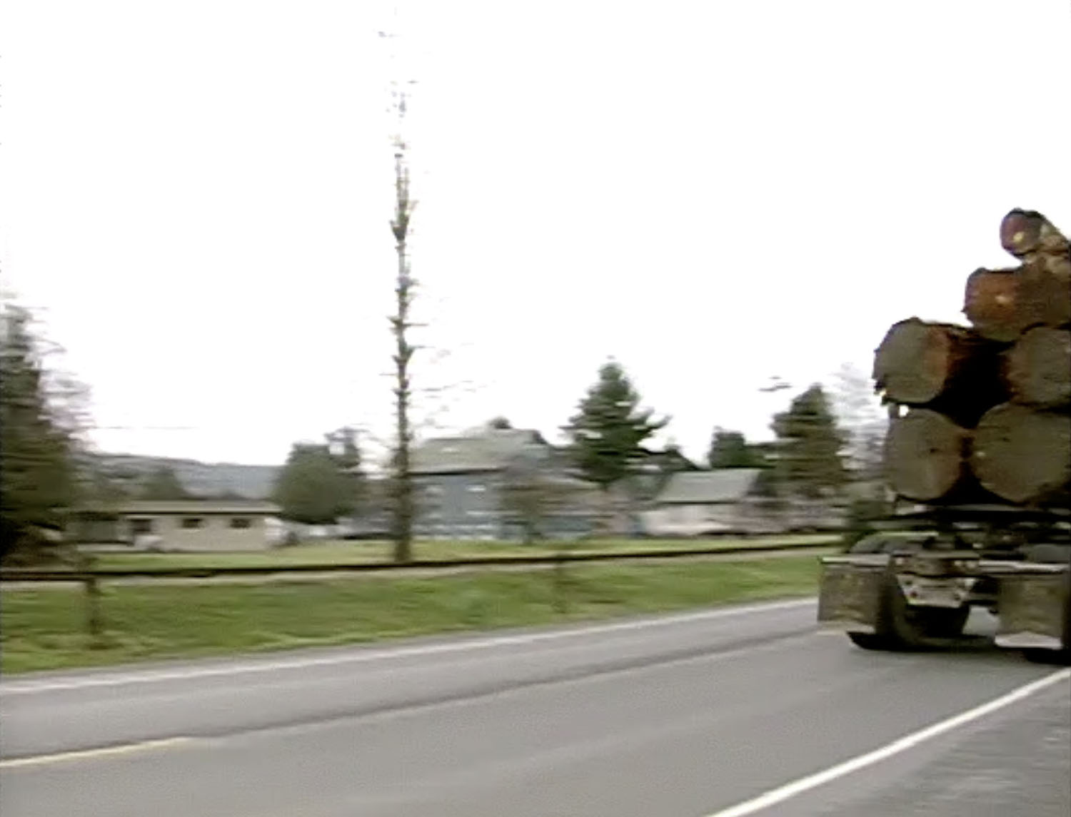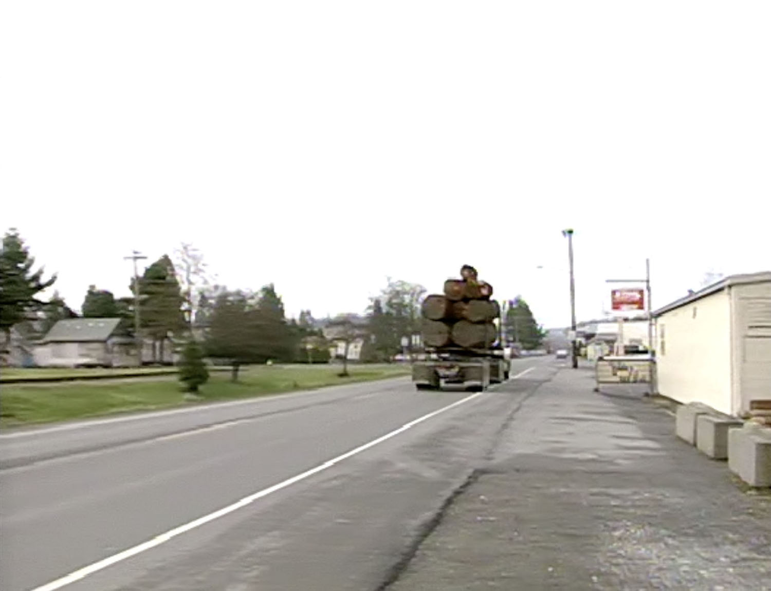 The video crew most likely captured footage of that logging truck entering Snoqualmie from the Big Edd’s parking lot. You can see the beige-colored building is still located down the street from Jeff Warren State Farm today.