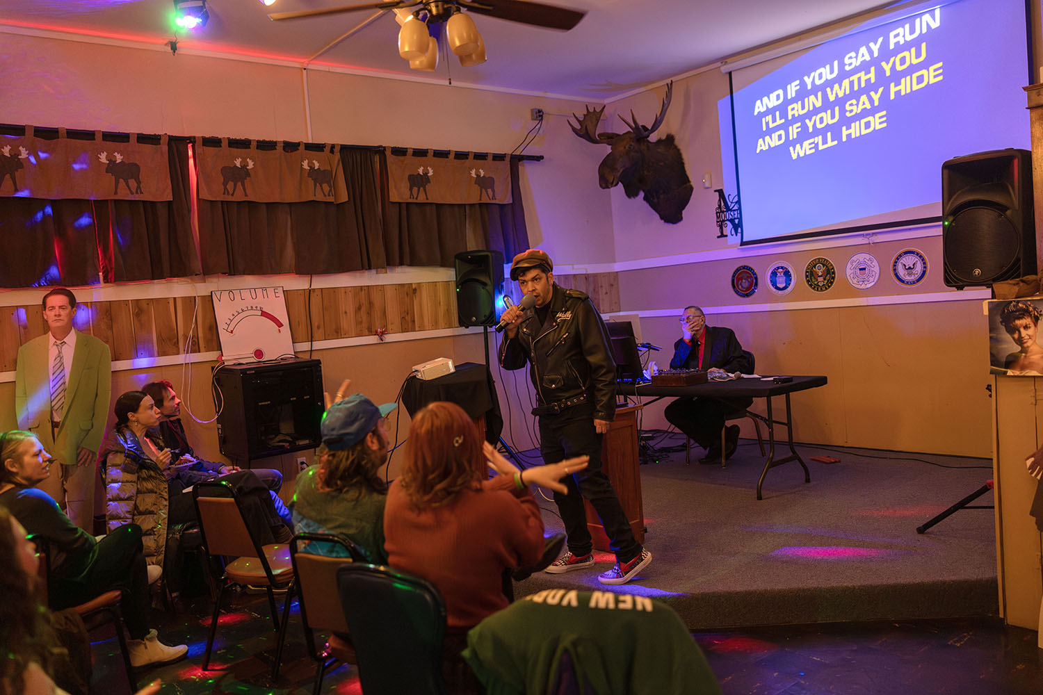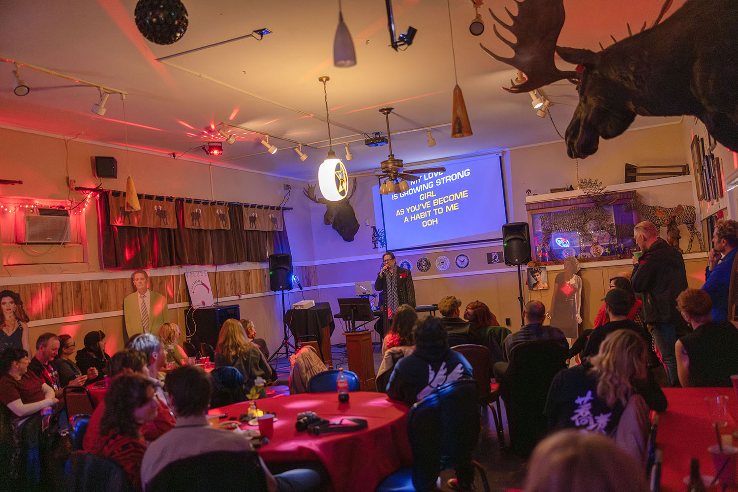Karaoke Jockey Dwaine Wheeler kicked off karaoke time with Steve Hiday channeling his best Ben from David Lynch’s Blue Velvet. The shirt he’s wearing is from Snoqualmie Brewing Company which serves a Ghostwood Kölsch named after Ben Horne’s development plans in the show.
