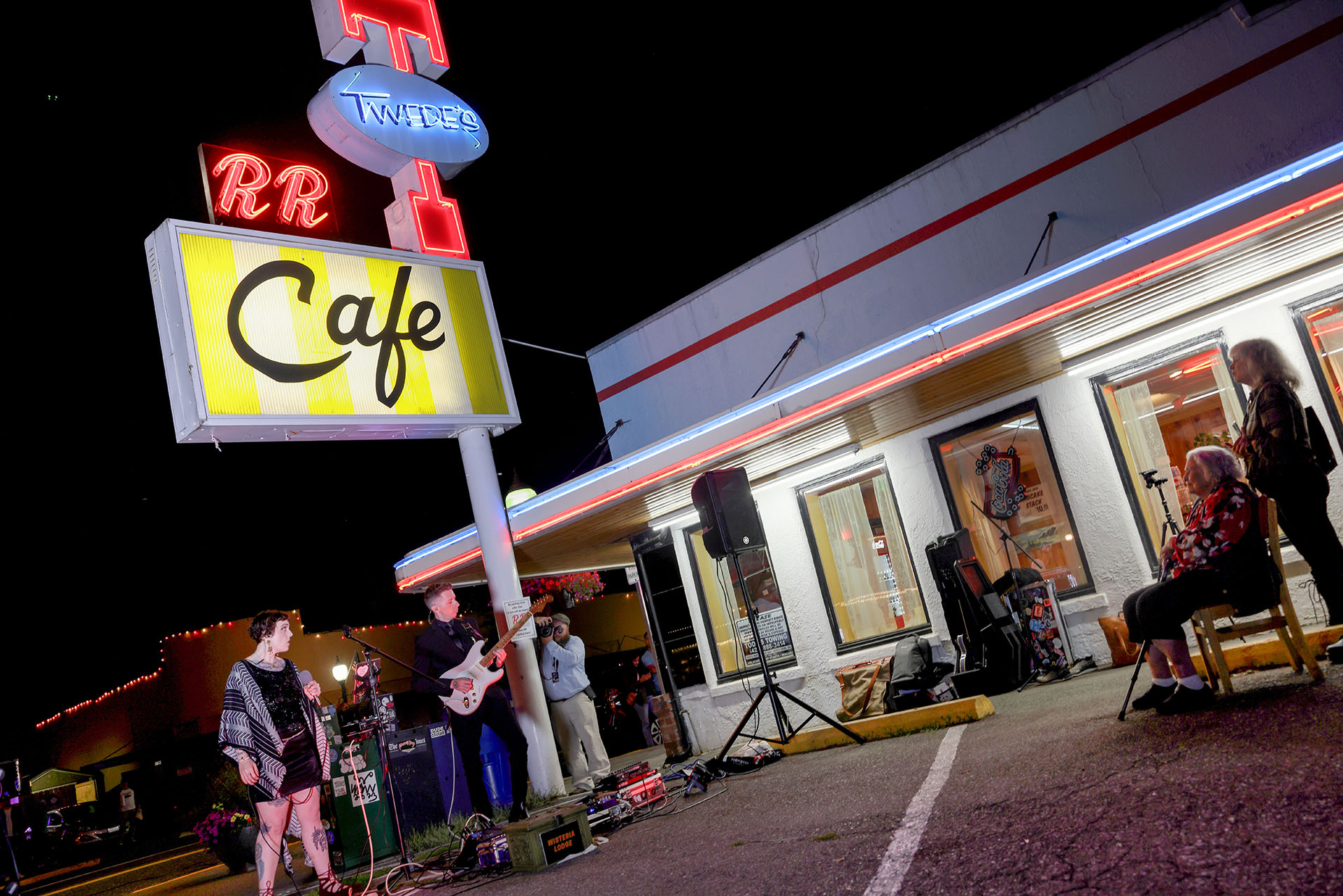 During that warm Summer night outside Twede’s Cafe in August 2023, Pat had a front-row seat as the Pacific Northwest’s “magickal” duo, Wisteria Lodge, played when the red neon sign was illuminated for the first time.
